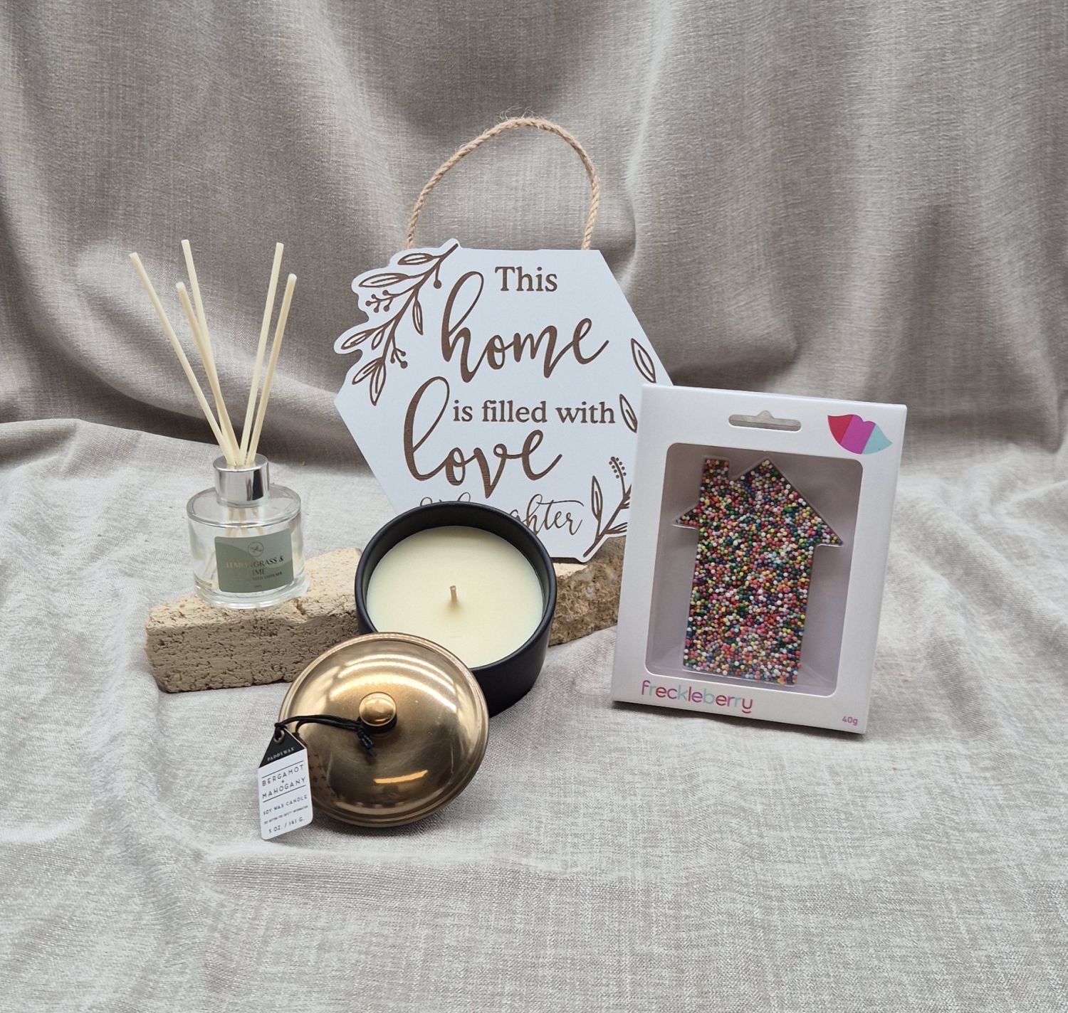 The Home Filled with Love Hamper is a heartfelt gift designed to bring warmth, comfort and joy into any space. Featuring softly scented home fragrances, a beautiful candle and a charming decorative keepsake, it’s the perfect way to celebrate new beginnings, housewarmings or thoughtful moments of care. Sweetly finished with a touch of indulgence, this hamper creates a welcoming atmosphere and reminds its recipient that home is truly where love lives.