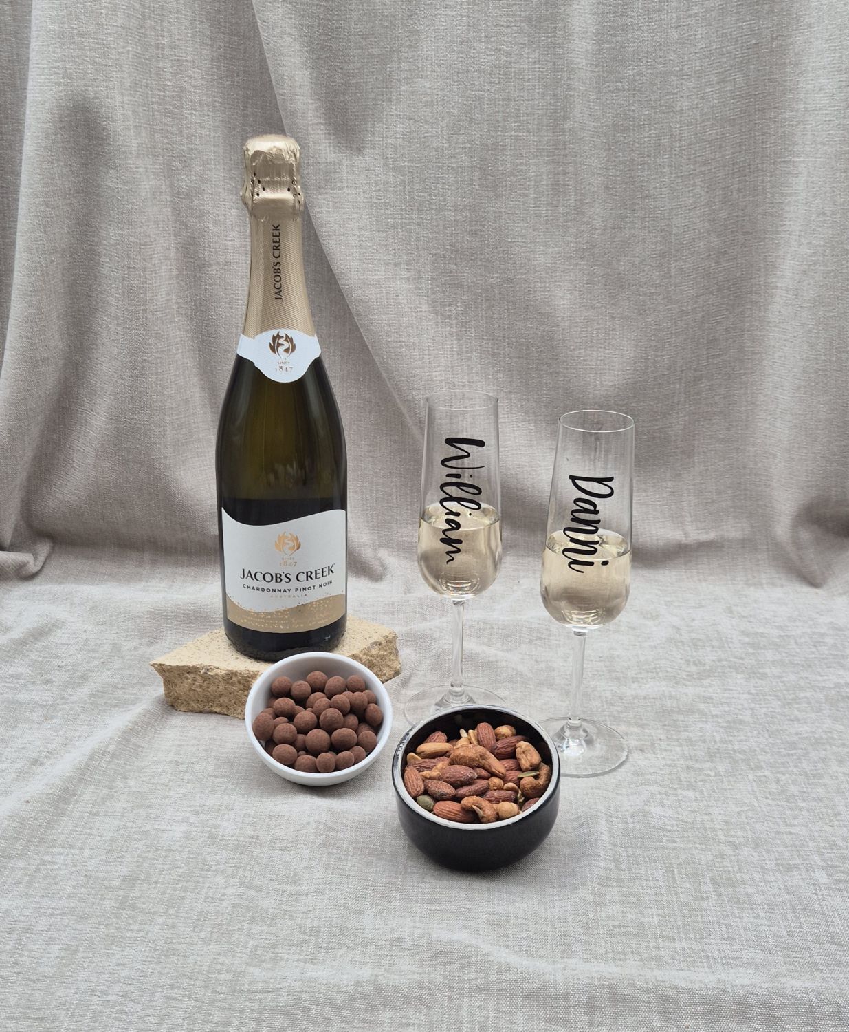 Pinot & Nibbles for Two is a beautifully curated hamper made for sharing and savouring special moments together. Featuring a bottle of Jacob’s Creek Pinot Noir, two personalised wine glasses, and a tempting selection of luxury nuts and chocolate-coated coffee beans, this gift is perfect for relaxed evenings, celebrations, or thoughtful surprises. Whether it’s for an anniversary, major event, thank-you, housewarming, or just because, it’s a stylish and personal way to toast life’s little moments.